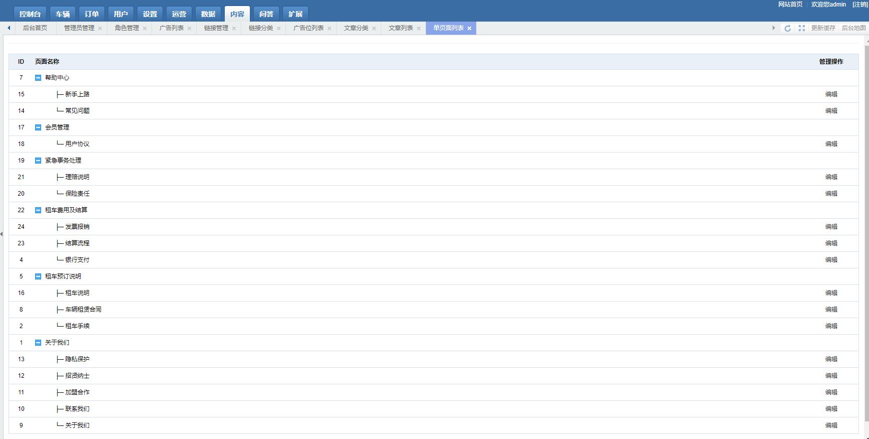 租车系统是用于租车公司进行车辆的租赁管理。分前后台两部分,前台可以实现车辆的长租、短租、车型搜索、门店管理、促销活动、常见问题、新闻快讯等功能。后台可以实现门店管理、车辆信息管理、订单管理、用户管理、系统设置和文章管理等功能。